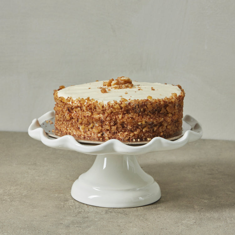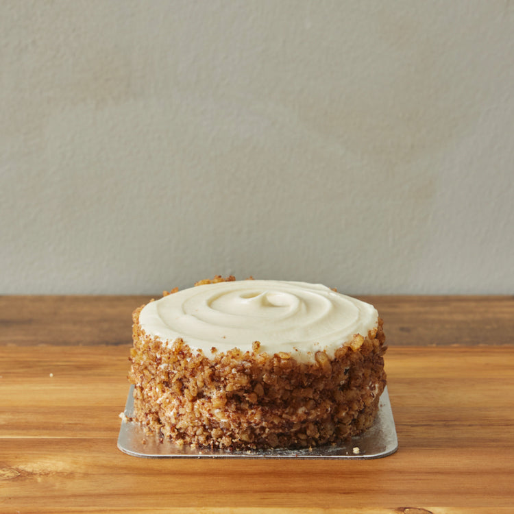 Two layers of spiced carrot walnut cake, filled and frosted with a premium whipped cream cheese and caramelized walnuts.