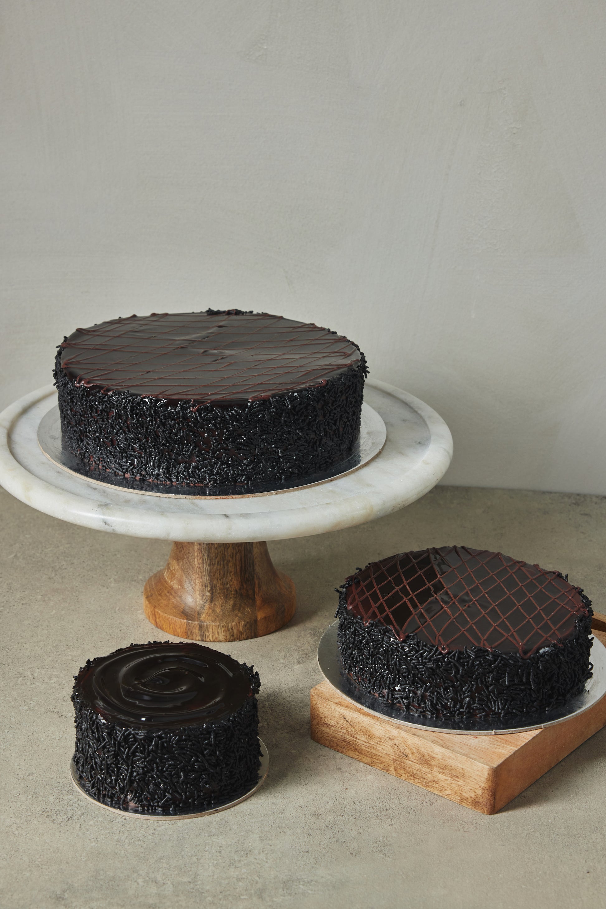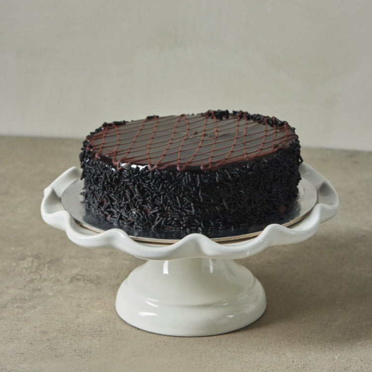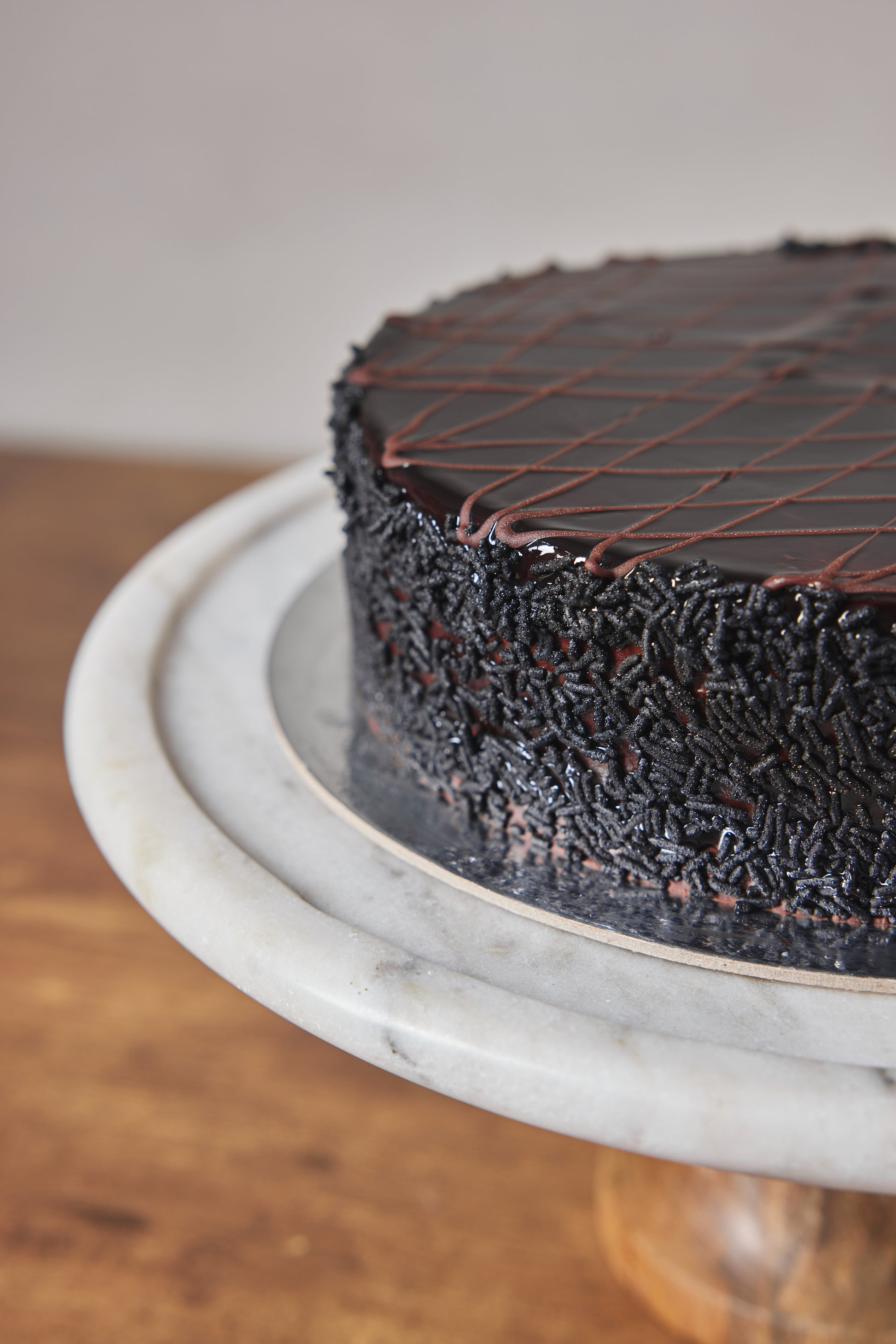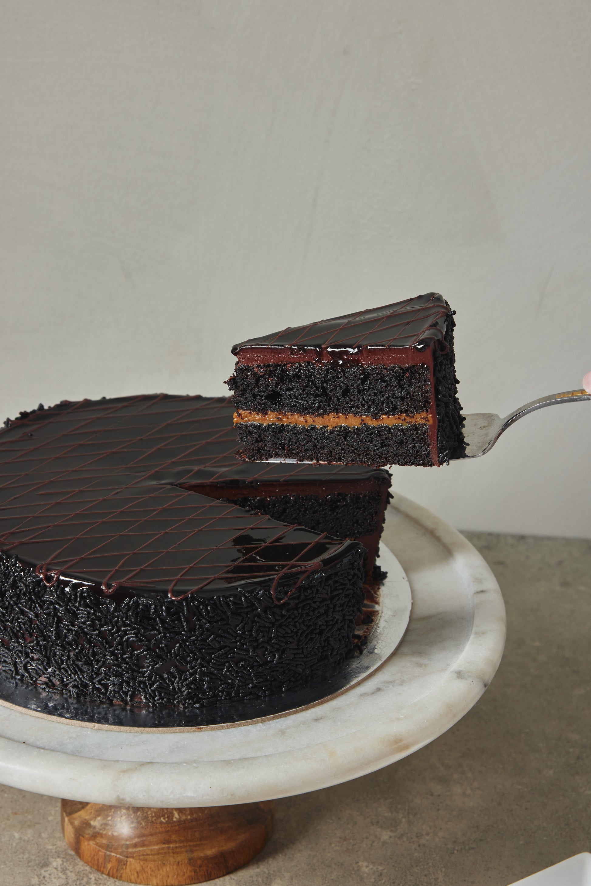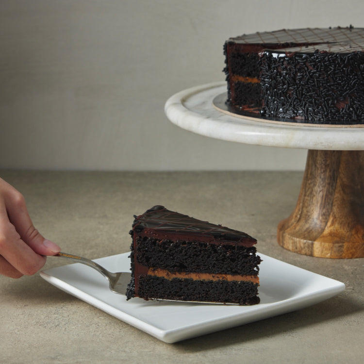 Two layers of moist, dense chocolate cake with a Dulce de Leche filling and frosted with 55% Dark Belgian Chocolate ganache.